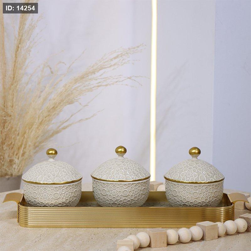 طقم/4 صينية زجاج +3 مضايف بورسلان بيج مزخرف اسلامي HJP14-4/S-KHAKI