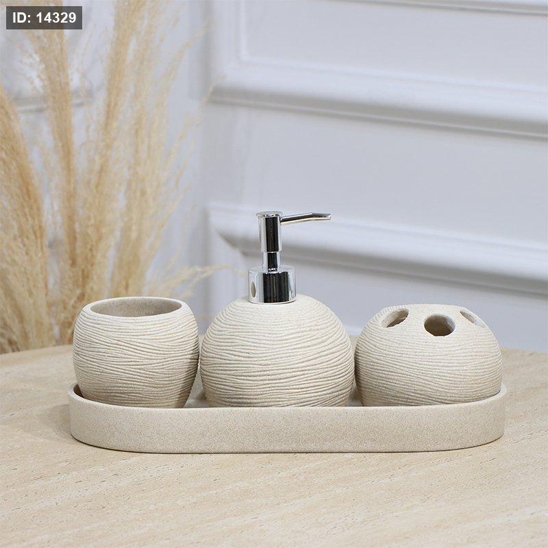 طقم/4 صينية بيضاوي مصبنة بيضاوي+ 2كاسة جبص بيج محزز EL177/14 =ت.ش3