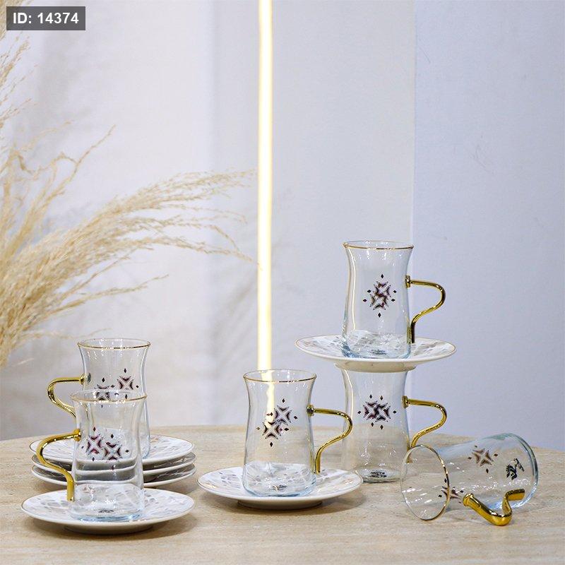طقم كاسة شاي 6/6 زجاج سادة مرسم يد وحز ذهبي متكة بورسلان 4907-6M-1934-2G ++ع.ج