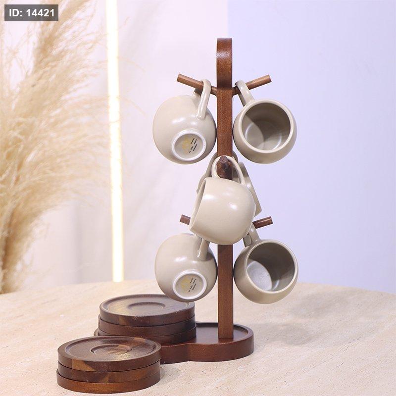 طقم فناجين قهوة بورسلان بيج ماط 6/6 مع ستاند خشب بني غامق YM25043 ++ع1
