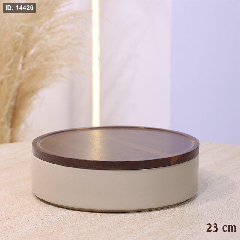 مضيفة بورسلان مدور بيج ماط 23سم غطاء خشب بني غامق YM1013 ++ع1