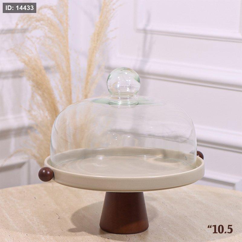 جاط كيك 10.5" بورسلان بيج ماط مع قاعدة و يدين خشب و غطاء زجاجي YM251076 ++ع1