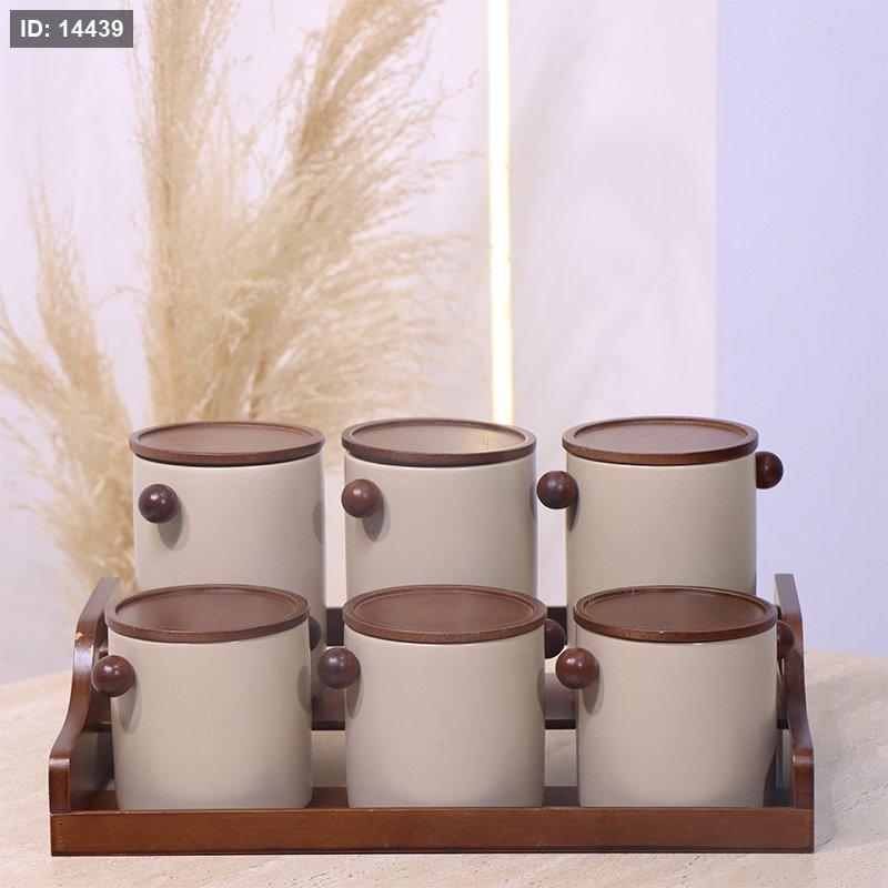 طقم بهارات /6 بورسلان بيج مط مع قاعدة ويدين خشب YM257119 ++ع1