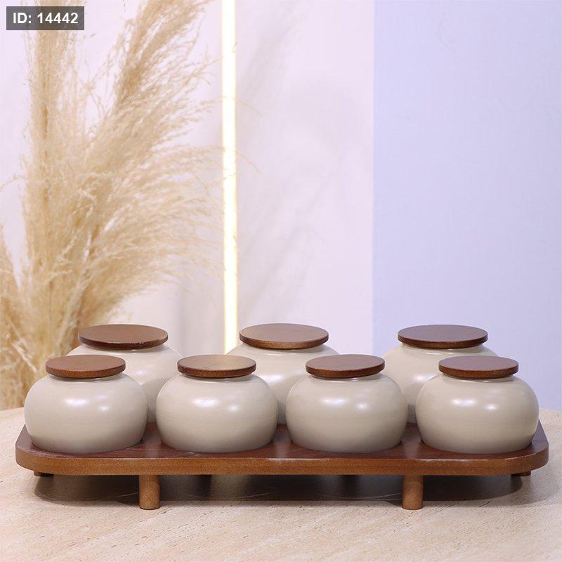 طقم بهارات /7 بورسلان قعده و غطاء خشبي بني غامق YM231004 ++ع1