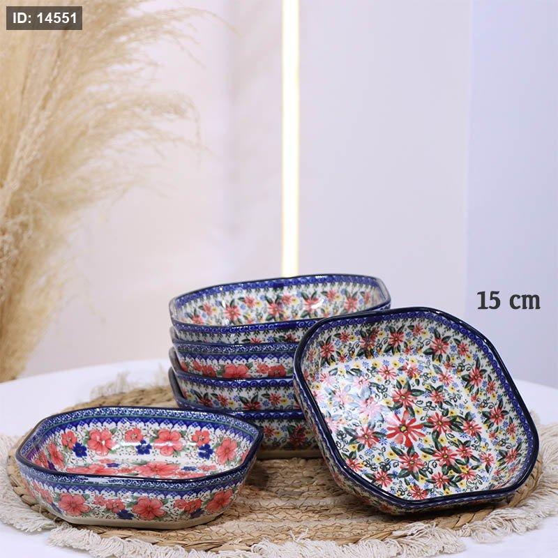 صحن بورسلان خزف 15سم شكل ثماني ت.ك6 اطار كحلي B197/6 مرسم ورد زهري كبير ++ZW