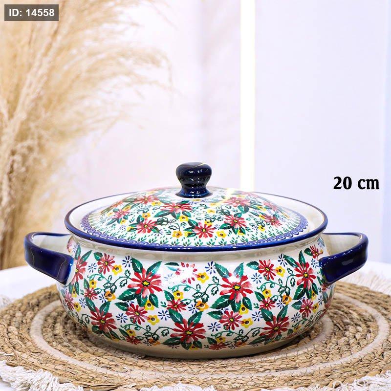 طنجرة بورسلان خزف 20سم اطار كحلي B090 وجه ورد بيج وزهري واخضر ++ZW