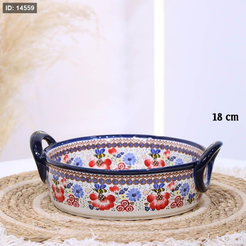صحن مدور بيدين حلقات بورسلان خزف 18سم اطار كحلي B094 مرسم ورد سنبلات احمر ++ZW