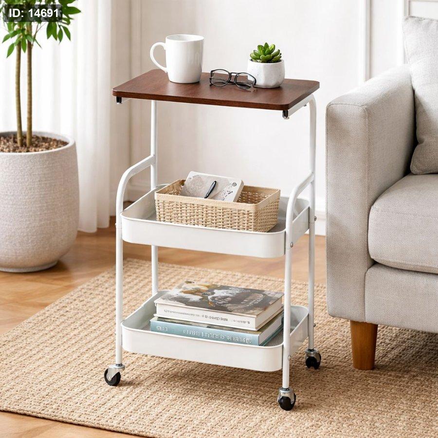 سلة 2 طبقة المنيوم ابيض وجه طاولة مستطيل خشب بني بعجلات A130/7 =ع1
