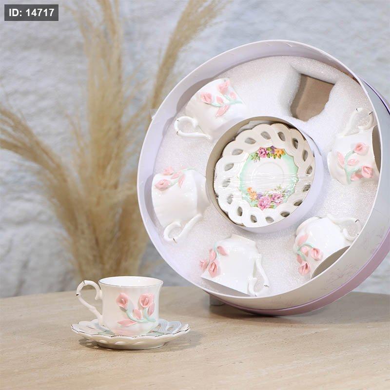 طقم فناجين قهوة 6/6 بورسلان ابيض بكلة ورد توليب علبة مدور A34/2 =ع1