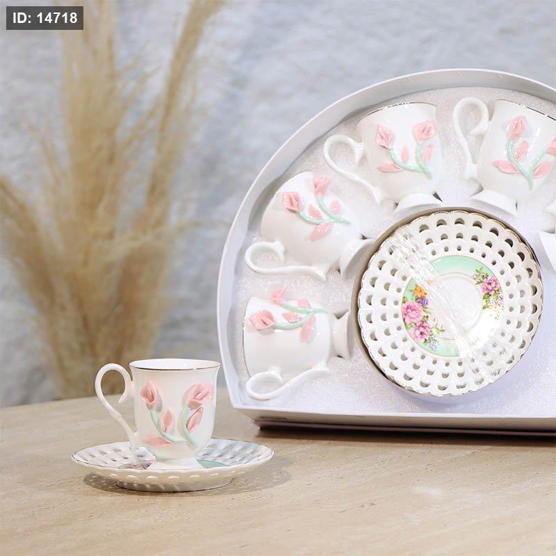 طقم فناجين قهوة 6/6 بورسلان ابيض بكلة ورد توليب علبة قوس A34/3 =ع1