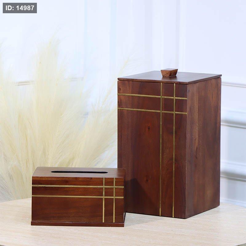 طقم/2 سطل + بكيت محارم مستطيل خشب بني محزز نحاس ذهبي HO202465 %ه12