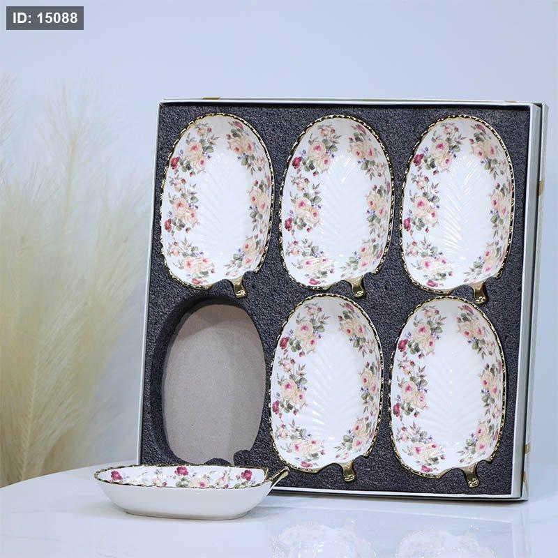 طقم صحون مكسرات بورسلان /6 ورقة بيضاوي ابيض 9002/A حيف ذهبي مرسم ورد بيج ++ع3