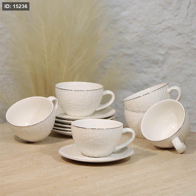 طقم فناجين شاي 6/6 بورسلان ابيض مبزر محزز حيف ذهبي A29/4 =ع4