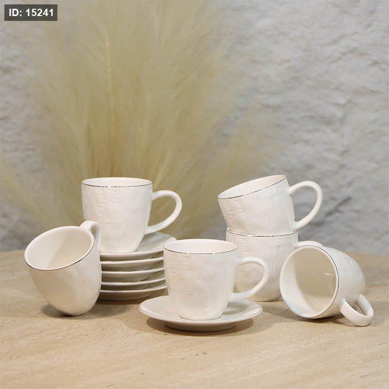 طقم فناجين قهوة 6/6 بورسلان ابيض اطار محززحيف ذهبي A48/23 =ع4