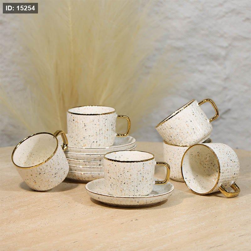 طقم فناجين قهوة 6/6 بورسلان ابيض محزز منقط الوان حيف ذهبي A48/39 =ع4