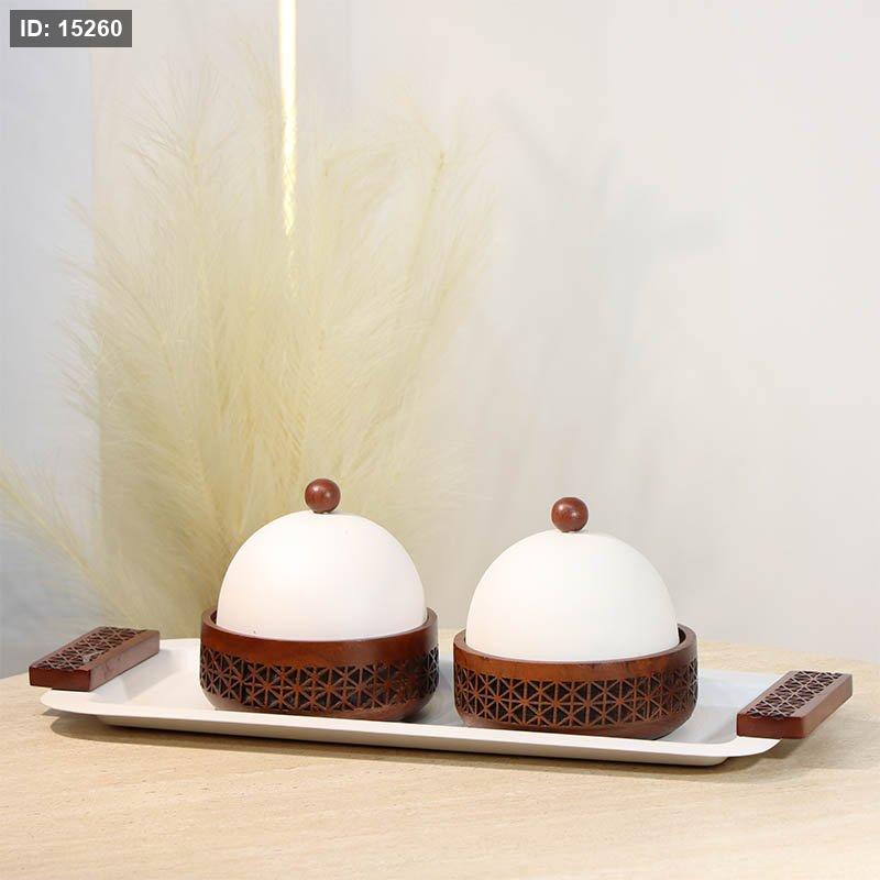 طقم3/ صينيه مستطيل تنك بيج + 2مضايف مدور خشب محفر 72617-B غطا قبة تنك بيج %ه13