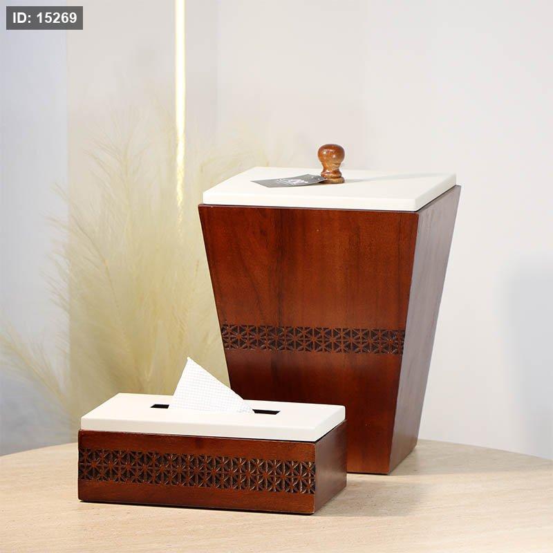 طقم 2/ سطل + بكيت محارم خشب محفر 72613/4205 غطا تنك بيج %ه13