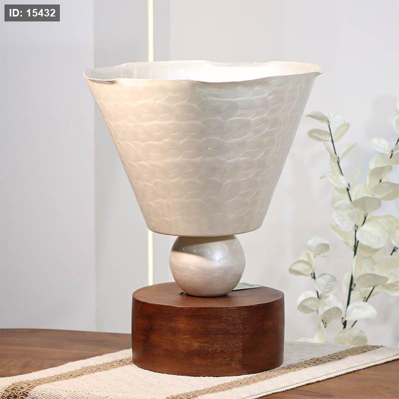 فازة تنك ابيض 39سم شكل سهارة 89635L قاعده خشب بني W هندي %ه14