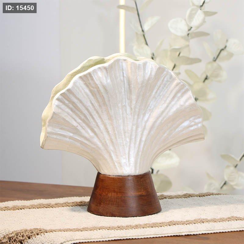فازة تنك ابيض 24سم ورقه محار محزز 89948S قاعدة خشب بني W هندي %ه14