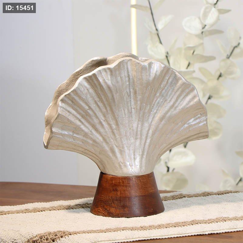 فازة تنك بيج 24سم ورقه محار محزز 89948S قاعدة خشب بني B هندي %ه14