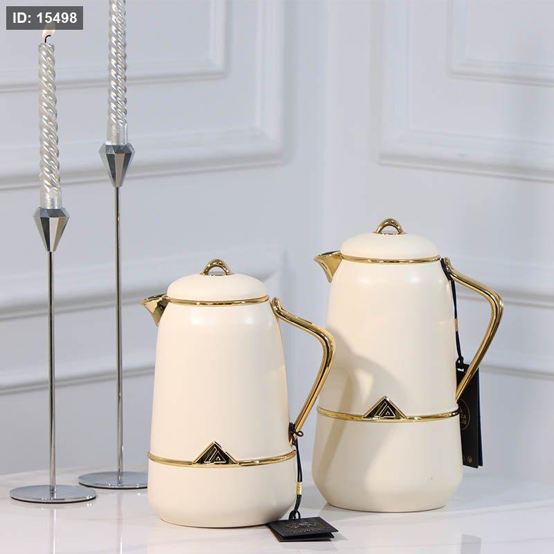 طقم /2 تيرموس قهوة + شاي بلاستك 1لتر بيج حز ذهبي يد ذهبي LA001-Beige لالوزا ++ع5