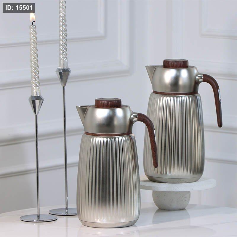 طقم /2 تيرموس قهوة + شاي بلاستك 1لتر فضي محزز يد خشبي JD005 لالوزا ++ع5