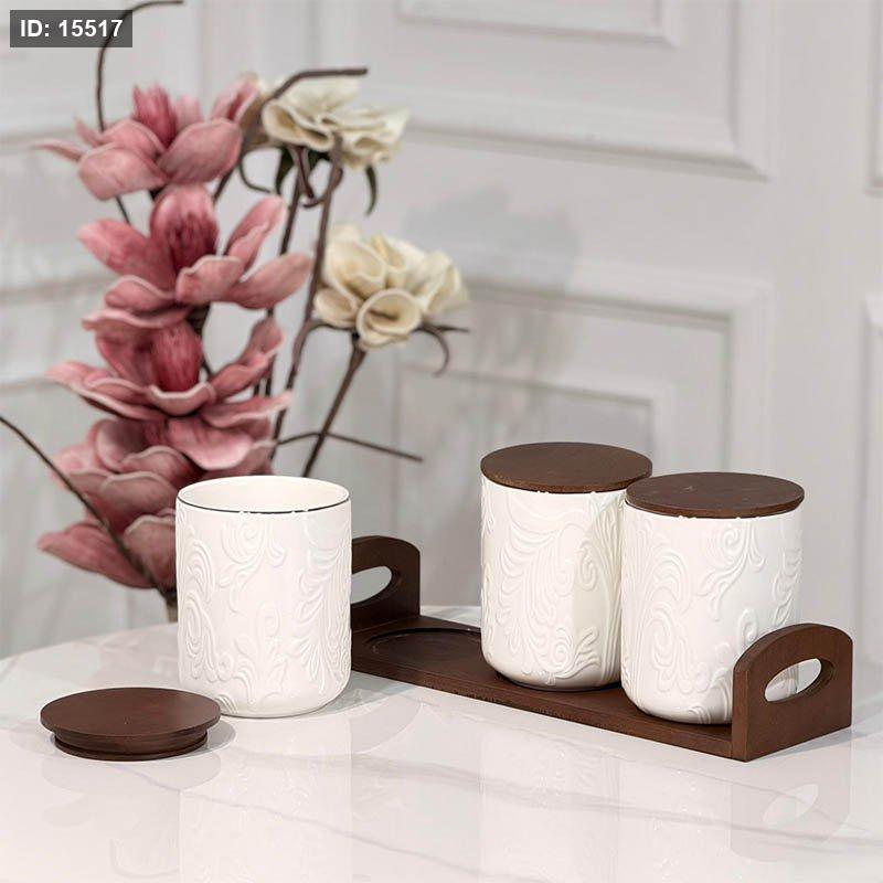 طقم بهارات/3 بورسلان ابيض مزخرف ورق حيف ذهبي+ صينية وغطا خشب JMD0573 ++ع6