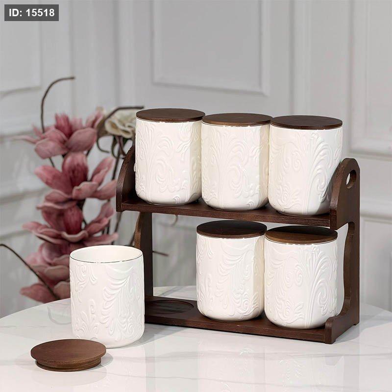 طقم بهارات/6 2طبقة ستاند وغطا خشب بورسلان ابيض مزخرف ورق حيف ذهبي JMD0574 ++ع6