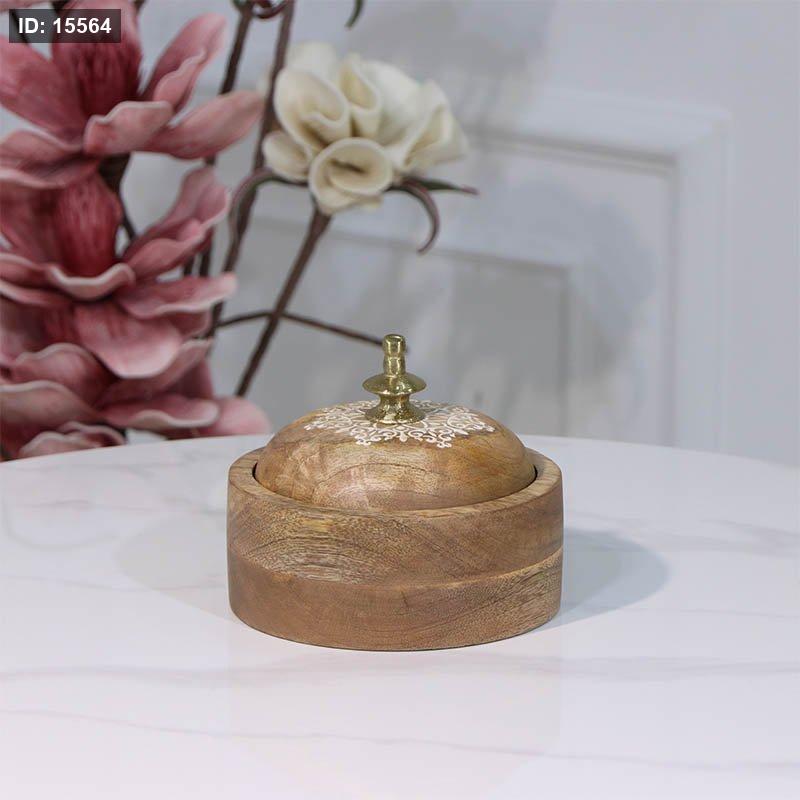 مضيفة خشب مدور 15 سم 89718 غطا قبه محفر مزخرف ابيض مسكة نحاس هندي %ه15