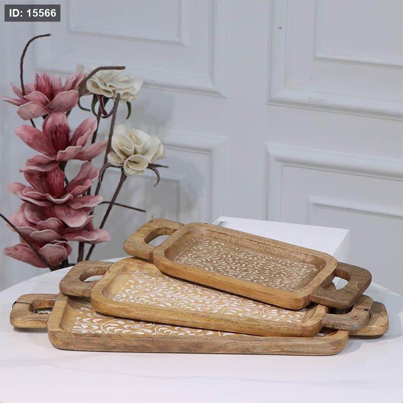 طقم صواني /3 خشب مستطيل 89712LMS وجه محفر مزخرف هندي %ه15