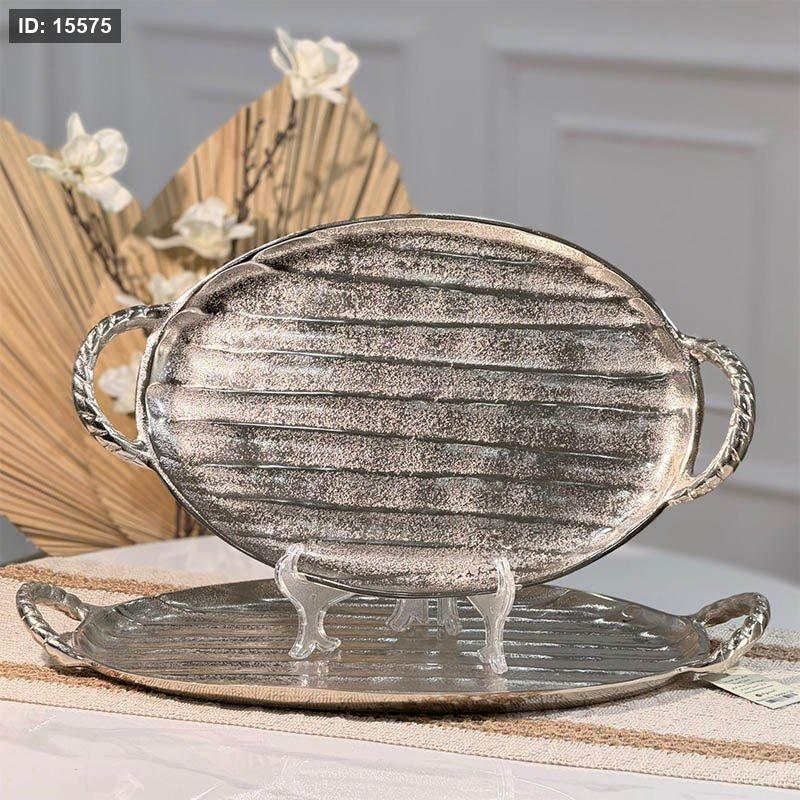 طقم صواني /2 بيضاوي نحاس فضي محزز 89956LS يدين مجدول هندي %ه15