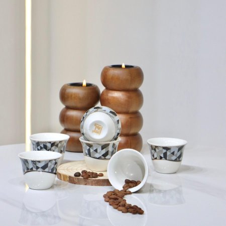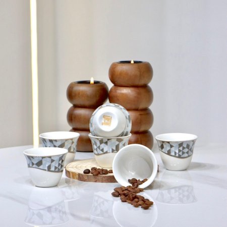 طقم 8 قطع مكون من 6 فناجين سادة + ستاند حمالة ذهبي + قاعدة صحن بورسلان ابيض ZD13665-1 ++لو