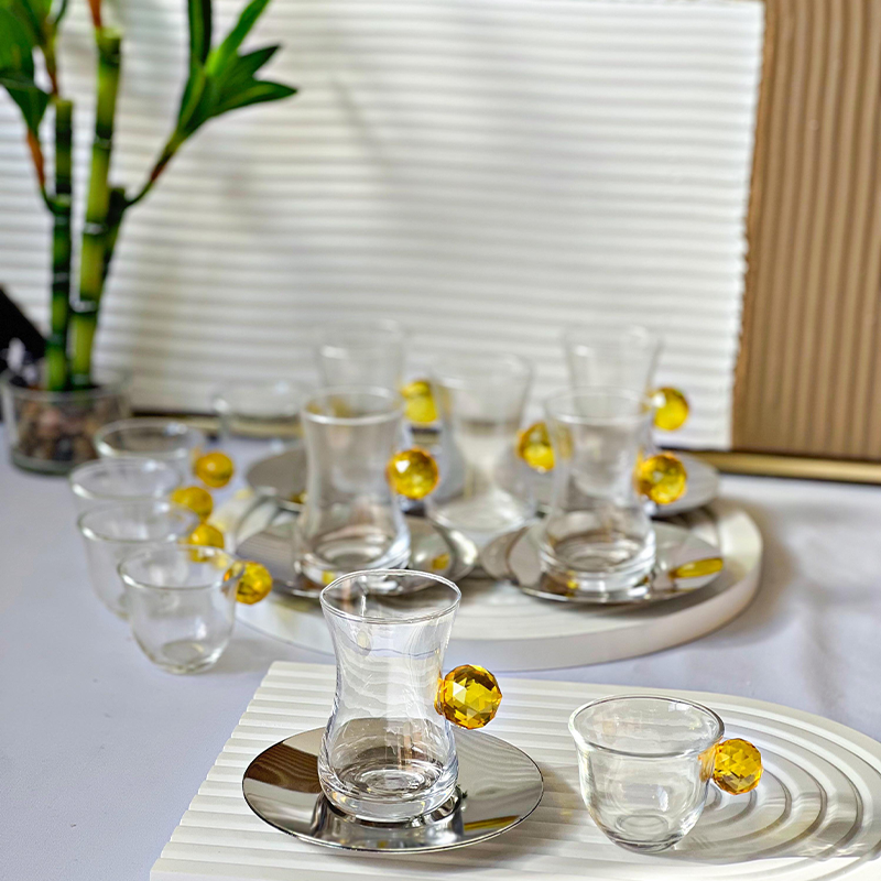 طقم /18 فناجين قهوة سادة /6 + كاسات شاي6/6 زجاج سادة يد جوهرة اصفر 609931 ++ج4