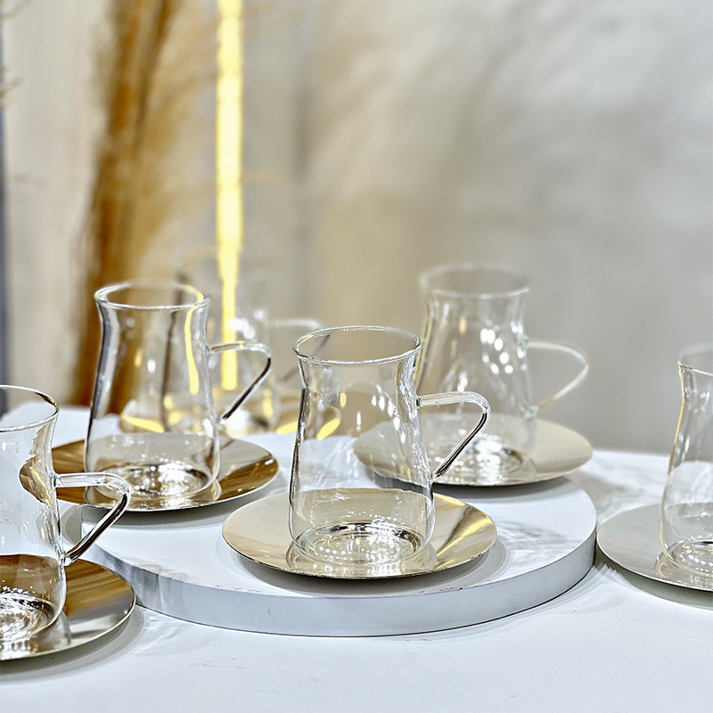 طقم كاسة شاي 6/6 زجاج بيد مثلث متكة ستانلس M++ KX87067