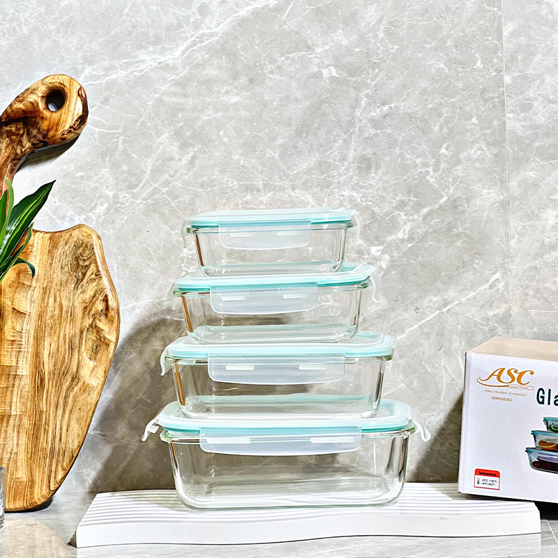طقم/4 بايركس مستطيل (15/17/20/22سم)زجاج حراري بغطا بلاستك كبس KX83102 ++ح
