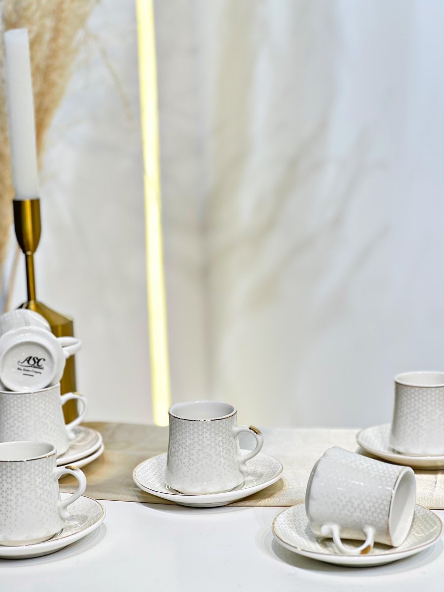 طقم فناجين قهوة 12/12 بورسلان ابيض اسطواني قاعدة مشرف مرسم مثلثات صغير M++ A369-3