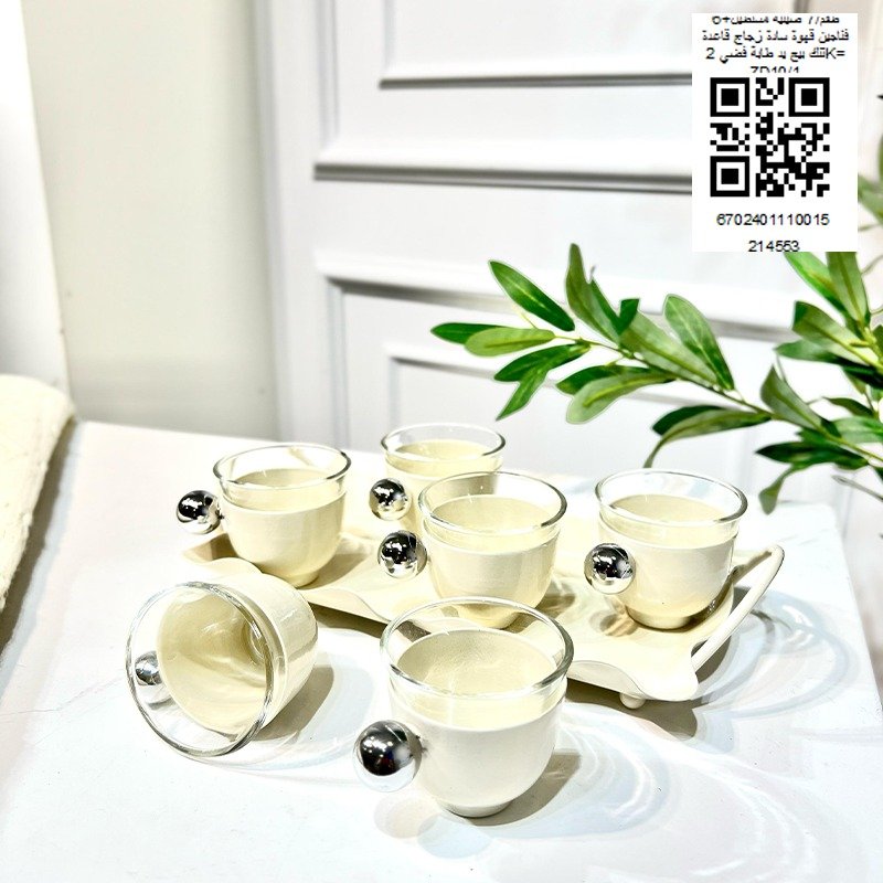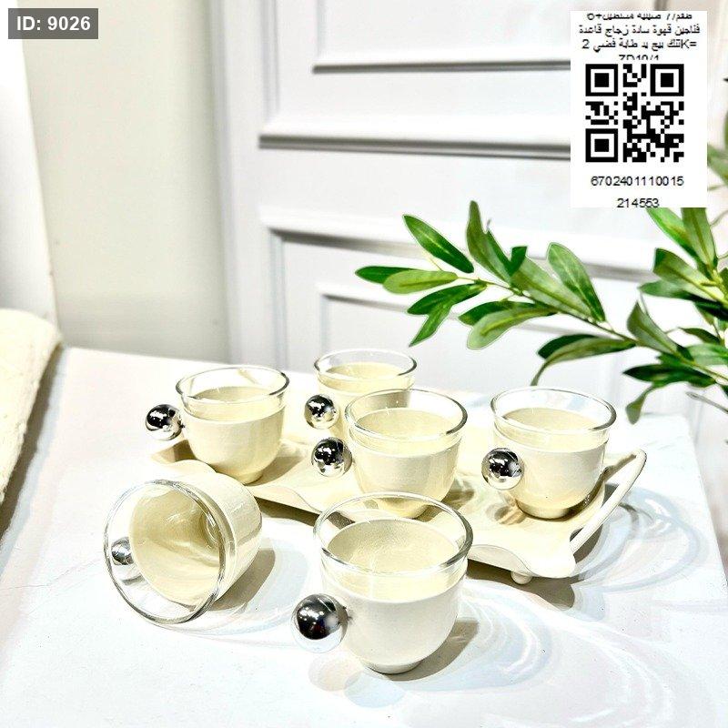 طقم/7 صينية مستطيل+6 فناجين قهوة سادة زجاج قاعدة تنك بيج يد طابة فضي 2K= ZD10/1