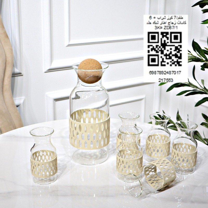 طقم/7 كوز شراب + 6 كاسات زجاج اطار شبك جلد 3K= ZD87/1