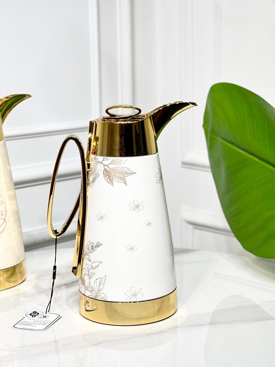 تيرموس 1 لتر ستانلس ابيض مورد يد وغطا ضغط ذهبي 312 +ط55