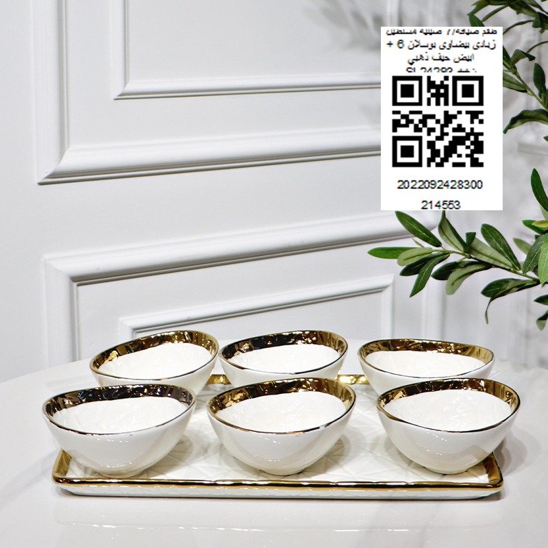 طقم ضيافة/7 صينية مستطيل + 6 زبادي بيضاوي بوسلان ابيض حيف ذهبي ع.ك اخضر SL24293 ++ن