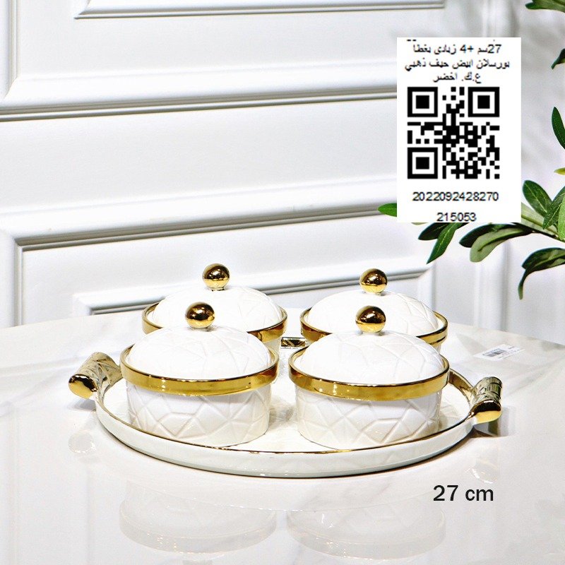 طقم ضيافة/9 صينية مدور 27سم +4 زبادي بغطا بورسلان ابيض حيف ذهبي ع.ك. اخضر SL24289++ن