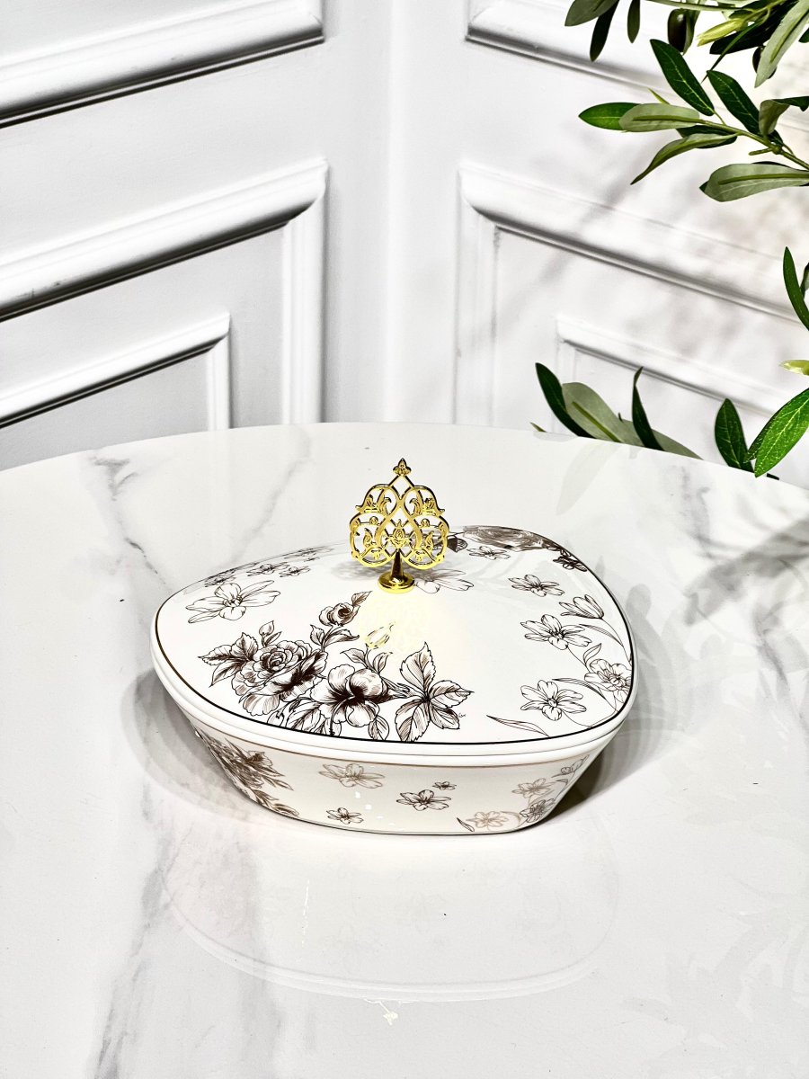 مضيفة بورسلان بيضاوي جور 20سم ابيض مرسم ورد بني مسكة ذهبي K37 ++ن