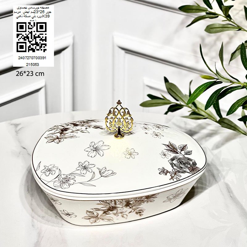 مضيفة بورسلان بيضاوي جور 26*23سم ابيض مرسم ورد بني مسكة ذهبي K39 ++ن
