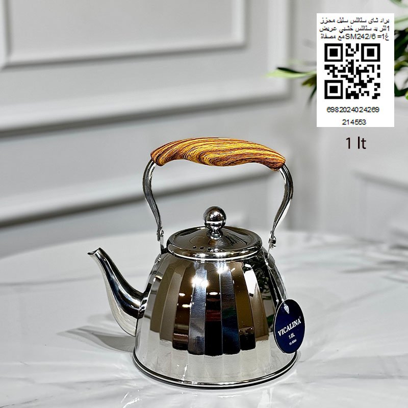 ابريق شاي ستانلس ستيل محزز 1لتر يد ستانلس خشبي عريض مع مصفاة SM242/6 =غ1